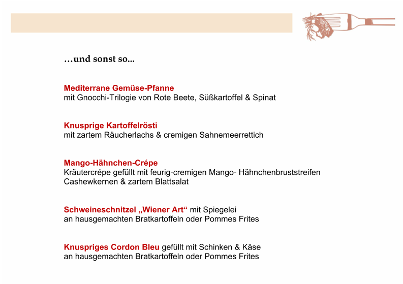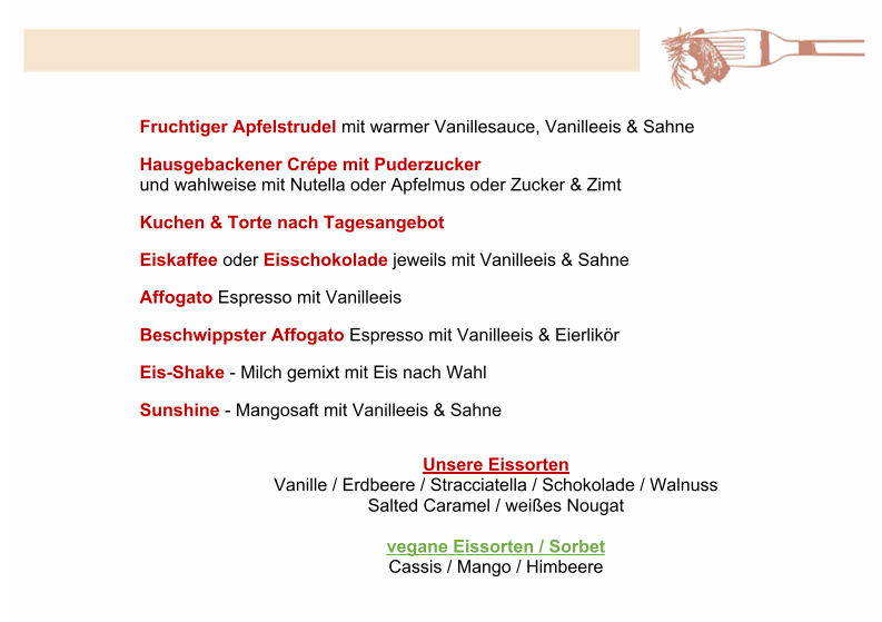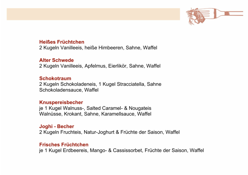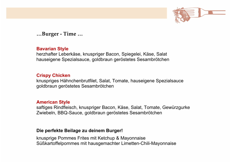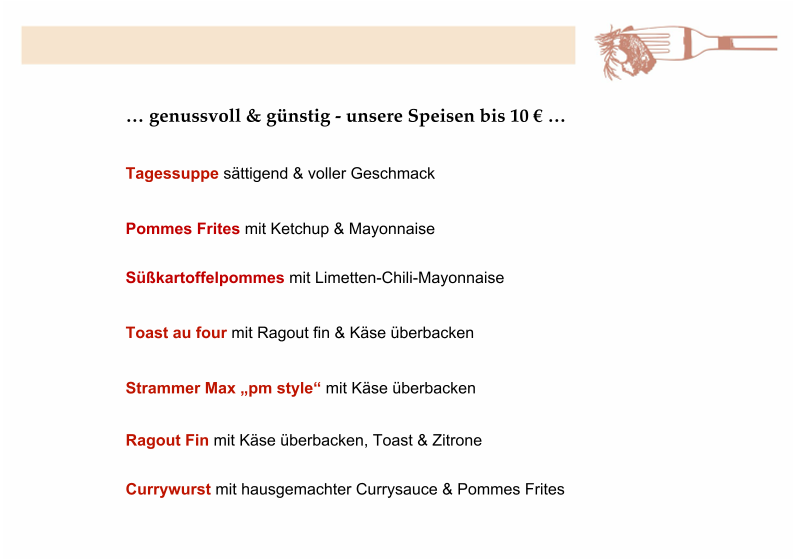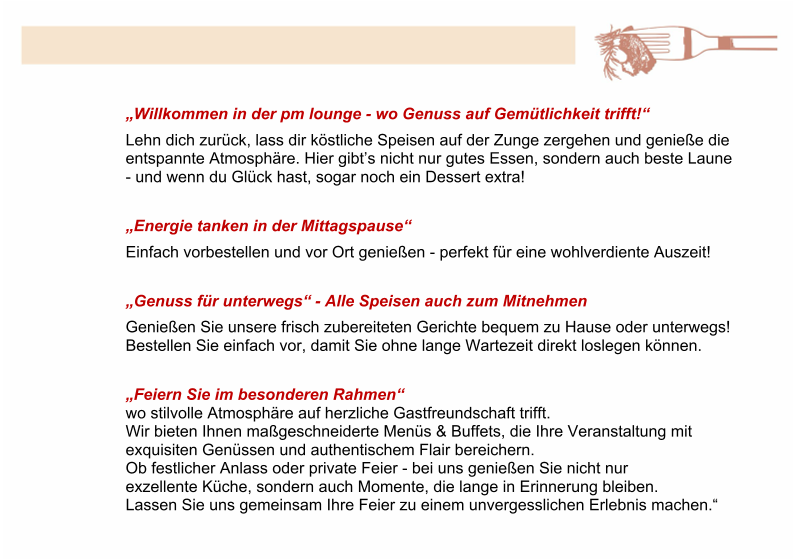Wrapping up my look at the menu at PM Lounge (Brückenstraße 24, 07973 Greiz), the kitchen keeps things casual, comforting, and pleasantly varied-especially in the “genussvoll & günstig” selection where dishes come in at up to 10 €. If you’re after something quick and satisfying, options like Tagessuppe, Pommes Frites, Süßkartoffelpommes, Toast au four, and the hearty Strammer Max “pm style” make it easy to grab a warm bite without overthinking it. Burger fans aren’t left out either: the Bavarian Style, Crispy Chicken, and American Style choices feel like the main event, and the menu even hints at “the perfect side” to round out your burger order. Beyond that, the “und sonst so” section adds welcome balance with lighter and homier plates such as Bunte Salat - Bowl, Bauernfrühstück, Omelette “Italiano”, Pasta der Saison, and Mediterrane Gemüse-Pfanne, giving you something whether you’re craving fresh, filling, or seasonal. Dessert is where PM Lounge gets playful: classic scoops like Vanille, Erdbeere, Stracciatella, Schokolade, Walnuss, Salted Caramel, and weißes Nougat sit alongside vegane Eissorten / Sorbet, and the sundae-style specials-Heißes Früchtchen, Alter Schwede, Schokotraum, Knuspereisbecher, and Joghi - Becher-make a strong case for staying a little longer after the meal. Overall, it’s a well-rounded menu that mixes budget-friendly staples, crowd-pleasing burgers, and a surprisingly broad ice cream lineup into a simple, satisfying finish.